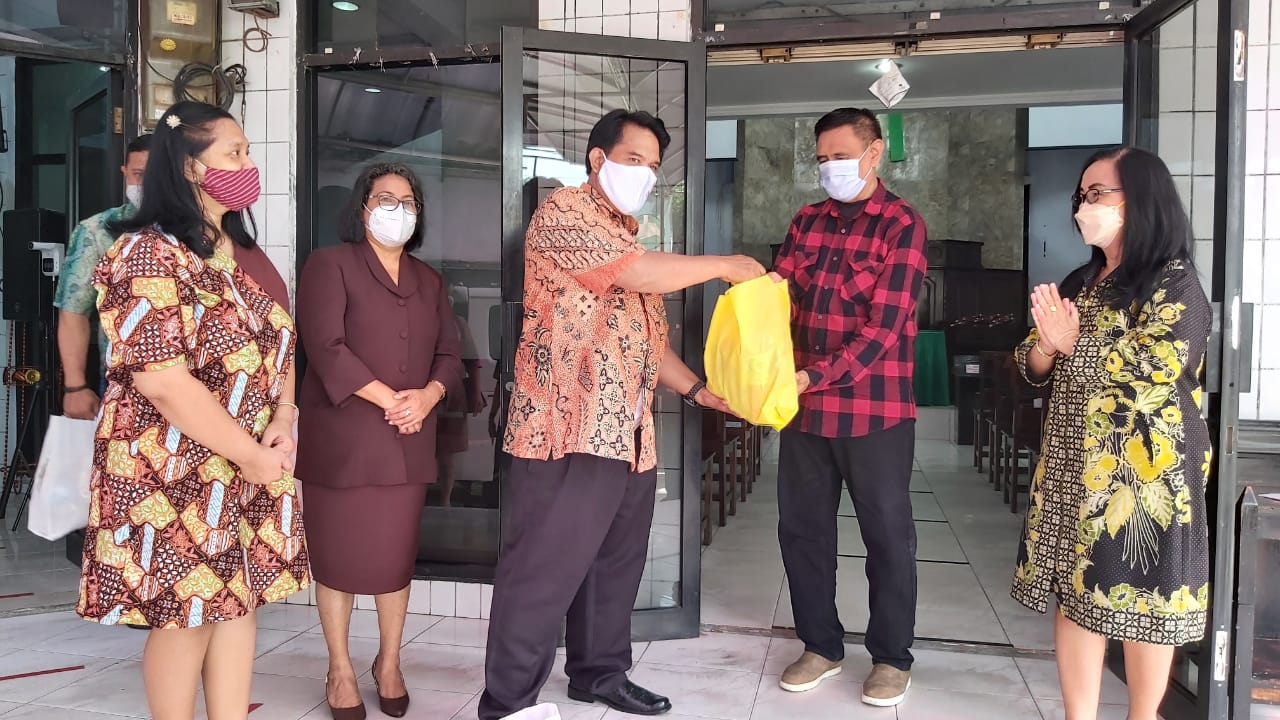Penyerahan bantuan sembako tersebut dilakukan oleh Ketua Majelis Jemaat GPIB Bethesda, Pendeta Stephen Gabriel Rockyfeller Sihombing setelah usai memimpin Ibadah Luring-Daring Jemaat GPIB Bethesda, 13 Juni 2021, pukul 09.30 WIB. Ketika memberikan bantuan tersebut, Pendeta Stephen menyampaikan kepada anggota jemaat yang menerima bahwa bantuan tersebut merupakan bentuk kepedulian gereja terhadap jemaat yang layak dibantu, yang terdampak pandemi Covid-19. Turut menyaksikan penyerahan bantuan tersebut, sejumlah Pengurus Pelkes GPIB Bethesda, diantaranya, Diaken Petty Sahetapy dan Ibu Mien Soeksmonowati serta anggota Majelis Jemaat GPIB, Penatua Deselina Patty-F dan Diaken R.R.B Picaulima (Bento) serta sejumlah anggota jemaat yang menghadiri ibadah tatap muka di gedung gereja. (ap)