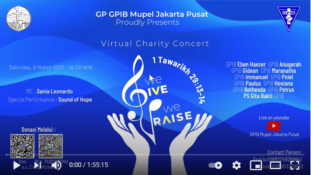 Hari Sabtu, 6 Maret 2021 bertempat di gedung Gereja Jemaat GPIB Petrus, Gerakan Pemuda melakukan Virtual Charity Concert. Tema yang diangkat untuk Virtual Charity Concert ini adalah WE GIVE WE PRAISE dimana tema ini menjadi dasar bahwa Mengasihi Tuhan itu bukan hanya sekedar ritual dengan beribadah atau memujiNya di Gereja, tetapi juga Aktual dengan membagikan kasih Tuhan kepada saudara-saudara yang membutuhkan.
